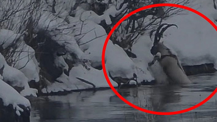 Karlı dağlarla çevrili vadide bir dağ keçisinin buz gibi dereyi yüzerek karşıya geçmesi, izleyenlere belgeselleri aratmayan anlar yaşattı.