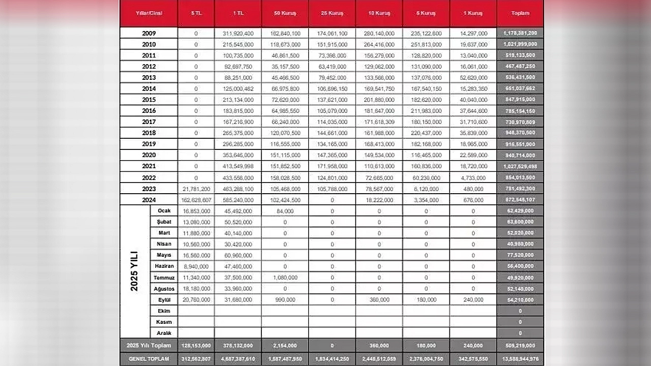Eylül ayında böylece madeni ufaklık paralar toplamda 54 milyon 210 bin lira olarak basılmış oldu.