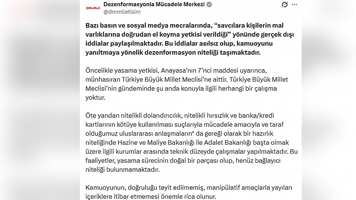 İletişim Başkanlığı, sosyal medyada yayılan ve savcıların vatandaşların mal varlıklarına doğrudan el koyabileceği yönündeki iddiaların asılsız olduğunu açıkladı. Yetkililer, konuyla ilgili henüz yasama sürecinde bir çalışma bulunmadığını vurguladı.