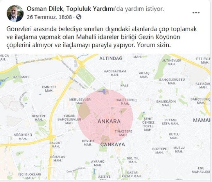Bu durumu gören, İl Genel Meclisi Üyesi olmasına ve sorunu ilgilere taşımasına karşın herhangi bir sonuç alamayan MHP İl Genel Meclisi Üyesi Osman Dilek, çözümü sosyal medya hesabından “topluluk yardımı” etiketiyle ve Ankara haritası görseliyle Ankara’daki yetkililere taşımada buldu.