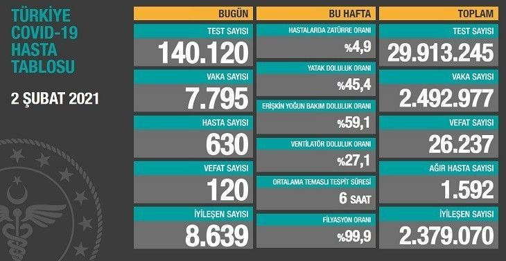 Sağlık Bakanlığının Covid-19 bilgilendirme sayfasında Türkiye’nin güncel korona virüs tablosu kamuoyuyla paylaşıldı. Tabloya göre son 24 saatte 120 kişi korona virüsten hayatını kaybetti, toplam can kaybı 26 bin 237’e yükseldi. Toplamda 29 milyon 913 bin 245 test yapıldı. Bugün yapılan 140 bin 120 testten, 7 bin 795 yeni vaka sayısı, 630 de yeni hasta sayısı olduğu belirtildi. Toplam vaka sayısının 2 milyon 492 bin 977 olduğu, bugün iyileşen 8 bin 639 kişiyle birlikte toplam iyileşen hasta sayısının 2 milyon 379 bin 70’e yükseldiği, toplam hastalarda zatürre oranının yüzde 4,9, ağır hasta sayısının ise 1 bin 592 olduğu açıklandı.
