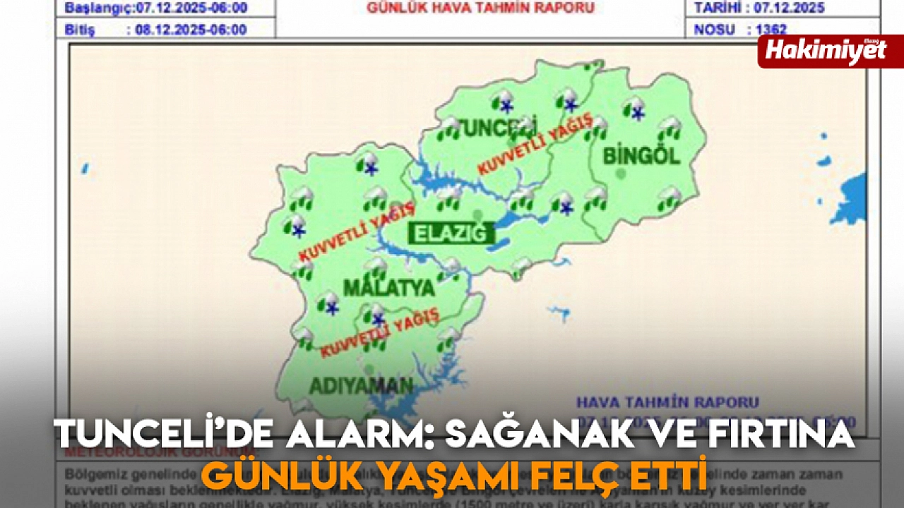 Meteoroloji 13’üncü Bölge Müdürlüğü’nün önceden yaptığı uyarıların ardından Tunceli’de şiddetli yağmur ve fırtına etkili oldu. Olumsuz hava şartları nedeniyle kent genelinde günlük yaşamda aksamalar yaşandı.
