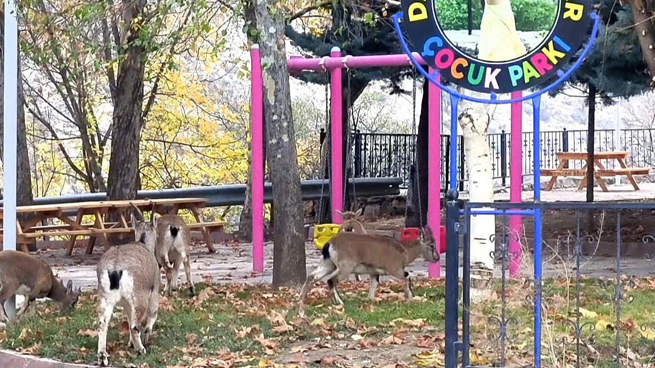 Tunceli'nin Çemişgezek ilçesinde son günlerde daha sık görülmeye başlanan yaban keçileri, bu kez çocuk parkında ortaya çıktı.