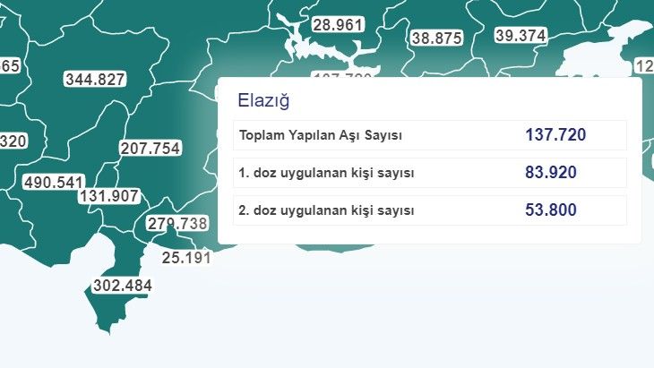 Elazığ'da toplam aşılanan kişi sayısı 137 bin 720 oldu. Birinci dozu olanların sayısı 83 bin 920, ikinci dozu olanların sayısı ise 53 bin 800 oldu.