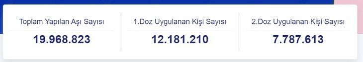 Türkiye geneli toplam aşılanan kişi sayısı 19 milyon 969 bin 192 oldu. Birinci dozu olanların sayısı 12 milyon 181 bin 525, ikinci dozu olanların sayısı ise 7 milyon 787 bin 667 oldu.