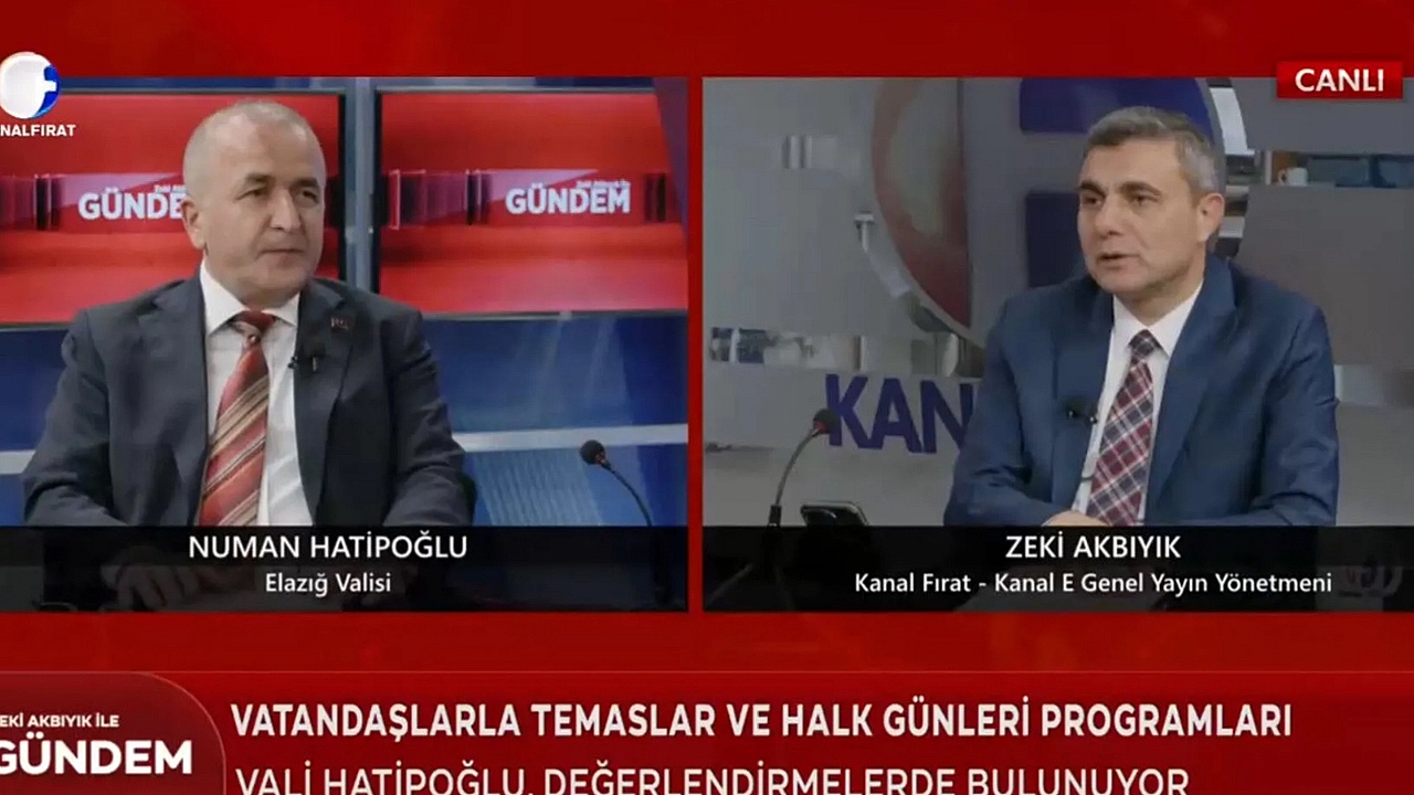 Kanal Fırat Ekranlarında Zeki Akbıyık'ın sunduğu Gündem programına konuk olan Elazığ Valisi Numan Hatipoğlu, şehir gündemine ve yapılan hizmetlere dair önemli açıklamalarda bulundu.