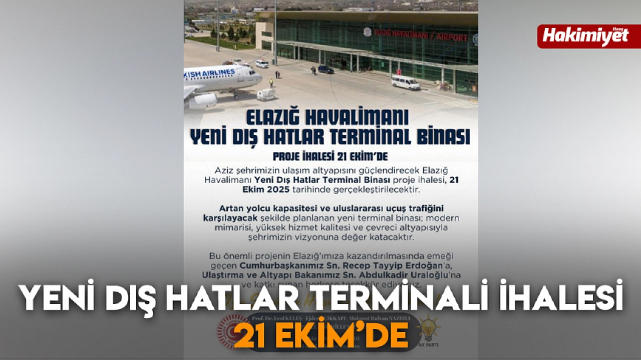 Elazığ'ın Havalimanı Yeni Dış Hatlar Terminal binası projesi için adım atılıyor. Projenin yapım ihalesi, 21 Ekim 2025 tarihinde gerçekleştirilecek.