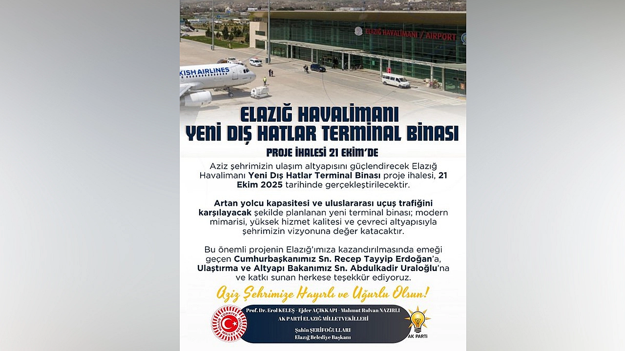 "Aziz şehrimizin artan yolcu kapasitesini ve uluslararası uçuş trafiğini en üst düzeyde karşılayacak olan Yeni Dış Hatlar Terminal Binası projesi ihalesi 21 Ekim’de yapılacaktır. Modern mimarisi, yüksek hizmet kalitesi standartları ve çevreci altyapısıyla planlanan bu yeni terminal, şehrimizin vizyonuna büyük bir değer katacaktır. Elazığ’ımızın sadece bölgesel değil, uluslararası alanda da önemli bir merkez haline gelme hedefine ulaşmasında bu proje kritik bir rol oynayacaktır." Dediler.